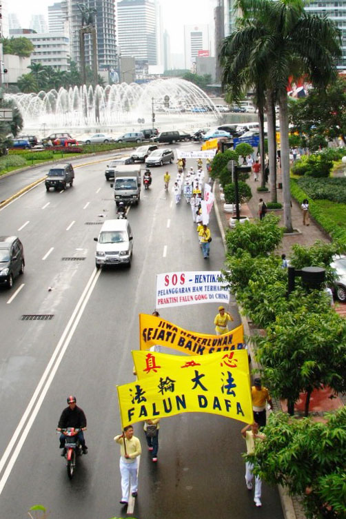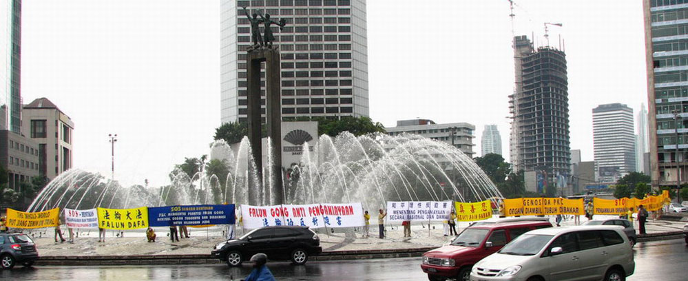 下午一点,法轮功学员来到印度尼西亚旅馆喷水池,展开横幅、手拿被中共迫害致死的法轮功学员相片、现场模拟演示中共用以迫害法轮功修炼者的酷刑,那醒目的横幅、肃穆的相片、血腥的酷刑,引起过往的车辆及路人关注。