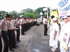 ![]() 总统府前的警官在向演示酷刑迫害的法轮功学员了解真相 |