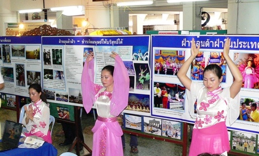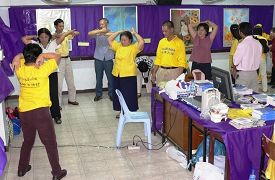 这次展览活动的主题是「心灵的力量使身体健康」,许多参观者来此获取各种简介,听取健康方面的演讲。法轮功学员在一楼展厅的展位悬挂大法轮图,摆放《转法轮》、真相资料、光碟等,并播放教功音乐。学员代表还做了介绍法轮大法的演讲。