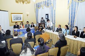 新唐人圣诞晚会新闻发布现场,左起:神韵艺术团团长关贵敏,李维娜、王学军伉俪,舞台总监陈缨,主持人林理善。