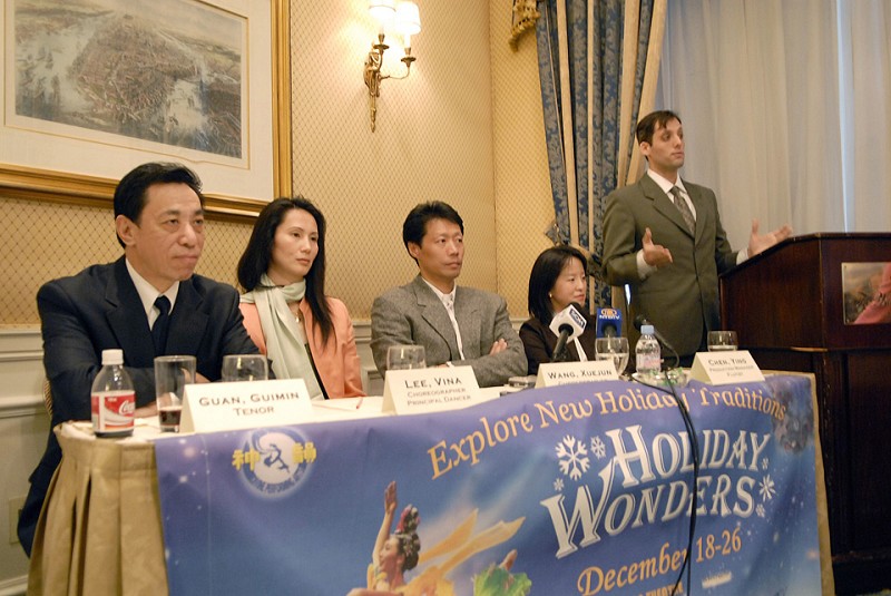 【明慧网二零零七年十二月十四日】(明慧记者黄凯莉报导)新唐人圣诞晚会将于二零零七年十二月十八日,分别在美国纽约百老汇与巴尔的摩两地同时拉开序幕。十三日中午,美国神韵艺术团在纽约曼哈顿华尔道夫(Waldorf Astoria)酒店召开记者会,部份主要担纲演员亮相,并介绍晚会。团长关贵敏先生表示,这么阵容庞大、表现纯真、纯善、纯美的中华文化的一流演出,在全世界,可以说是独一无二、绝无仅有的;此晚会将在全世界六十多个城市巡回演出,预期六十多万现场观众。
