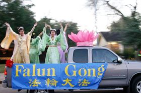 在社区游行队伍中,法轮功队伍的方阵前面是英文“法轮大法--真善忍”的横幅,后面是炼功队,小弟子手持炼功横幅,然后是花车,上面有四个身着唐装的“仙女”在炼功。看到法轮功学员慈悲祥和、功法优美,社区的市民都说:“太好了!”