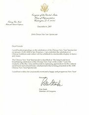 值此二零零八年一月二十三日至二十六日在旧金山庆祝华人新年晚会上演之际,我向你们表达衷心的祝愿。我深信,中华文化和传统的庆典,将在那令人难忘的音乐和歌舞声中展现。
