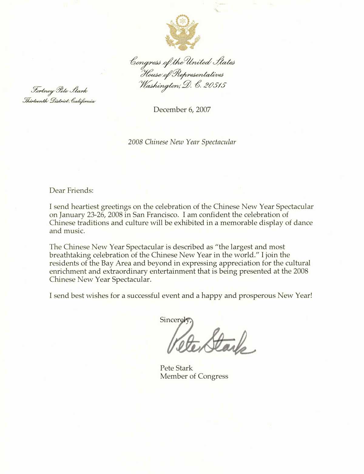 【明慧网二零零七年十二月十八日】(明慧记者王英编译报道)在二零零八年全球华人新年晚会即将于明年一月在旧金山上演之际,加州民主党国会议员彼得•斯塔克(Pete Stark)于二零零七年十二月六日,致函新年晚会主办方,祝晚会成功。