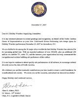 神韵艺术团十二月二十三日在格林斯伯勒的演出即将开始之际,我很荣幸代表北卡罗莱纳州议会,向晚会致以问候和褒奖。