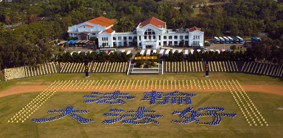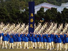 ![]() 约四千名法轮功学员以「隶书」壮丽优美的字体排出「法轮大法好」 |