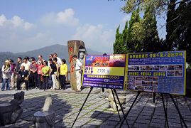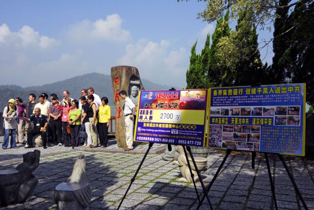 ![]() 日月潭玄光寺前,游客络绎不绝,旁边摆着的是目前中国大陆退出共产党的总人数与法轮功受迫害真相图片展示 |