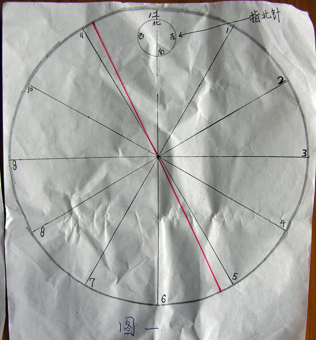 制作方法:一、圆形厚塑料或薄木片,最好用印模材筒盖,用量角器准确画出钟表盘形状,用直线把对应数字连起来。如6——12点,1——7点,3——9点等,直线都通过圆中心点。二、在12点下方挖一小圆洞,镶一小指北针,0度指向北方(镶上去的方法是:把指北针按在表盘12点下方画一轮廓,用税利小刀以轮廓大小挖洞,镶入指北针)用透明胶布固定,寻星装置基本完成。(如图一所示)