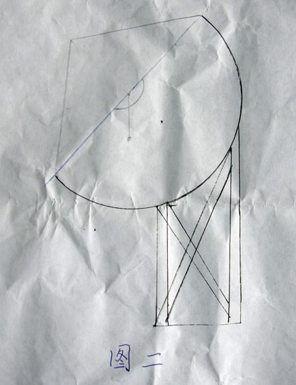 对于仰角调试方法,有同修在锅背面架子上测量,经试验不准确,因为架子一般都不均匀,以它为基准,差距很大,现介绍一法,在锅正面上下端对应拉一绳子,(绳子一头为钩,一头为磁铁最为方便操做)用量角器中心点做一垂线,对绳子進行测量,此方法很准确。(见图二所示)