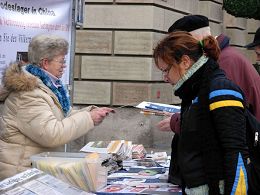 虽然天气寒冷,又是圣诞节前夕,很多路人都行色匆匆,但还是有不少路人驻足观看展板,或主动签名表示对法轮功学员的支持,或和学员交谈,向学员了解更多的真相。