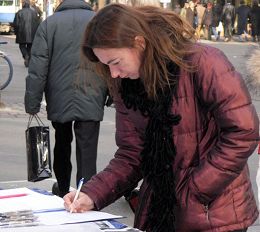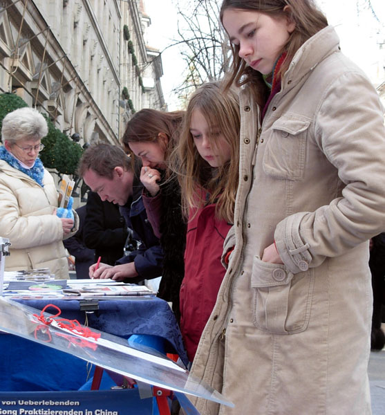 娜赫尔拿到法轮功学员分发的报纸后立即就翻看了起来,并向学员了解更多的真相。在离开前她签名要求制止中共活摘法轮功学员器官的罪行。此前她还没有听说过活摘器官的事情,只是知道在中共的统治下没有对人权的尊重。她觉的活摘器官非常糟糕,不是人的行为。在临走前她还拿了一份中文材料,因为现在她正在学中文,所以也希望把真相带给她的中国朋友。