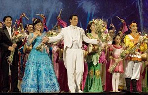 著名艺术家关贵敏、白雪十九日在纽约百老汇圣诞晚会结束后给观众谢幕。