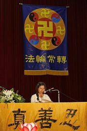 法会现场布置庄严肃穆,没有特别的仪式或重要人物讲话,重点在各地学员的修炼心得分享。发言者有原本不识字的老人,也有不满十岁的小孩,他们依序上台讲述自己在日常生活中,如何发现自己错误的观念,以及如何依照「真善忍」标准改正自己言行的经验,如何学好法并坚持炼功,在讲清法轮功被中共迫害真相时,遭遇到冲击心性的矛盾要如何善念对待的心得体会。由于个个都是刻骨铭心的亲身经历,还有坚持不懈的意志,所以与会的听众常不自觉感动落泪,这种场景的确非常特殊。