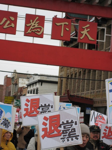 集会上,退党服务中心的代表等宣读了大纪元郑重声明,并介绍了退党大潮的近况,呼吁更多民众尽快加入“三退”大潮,共同见证这重要的历史关头。随后,与会民众在南中国城游行。