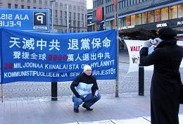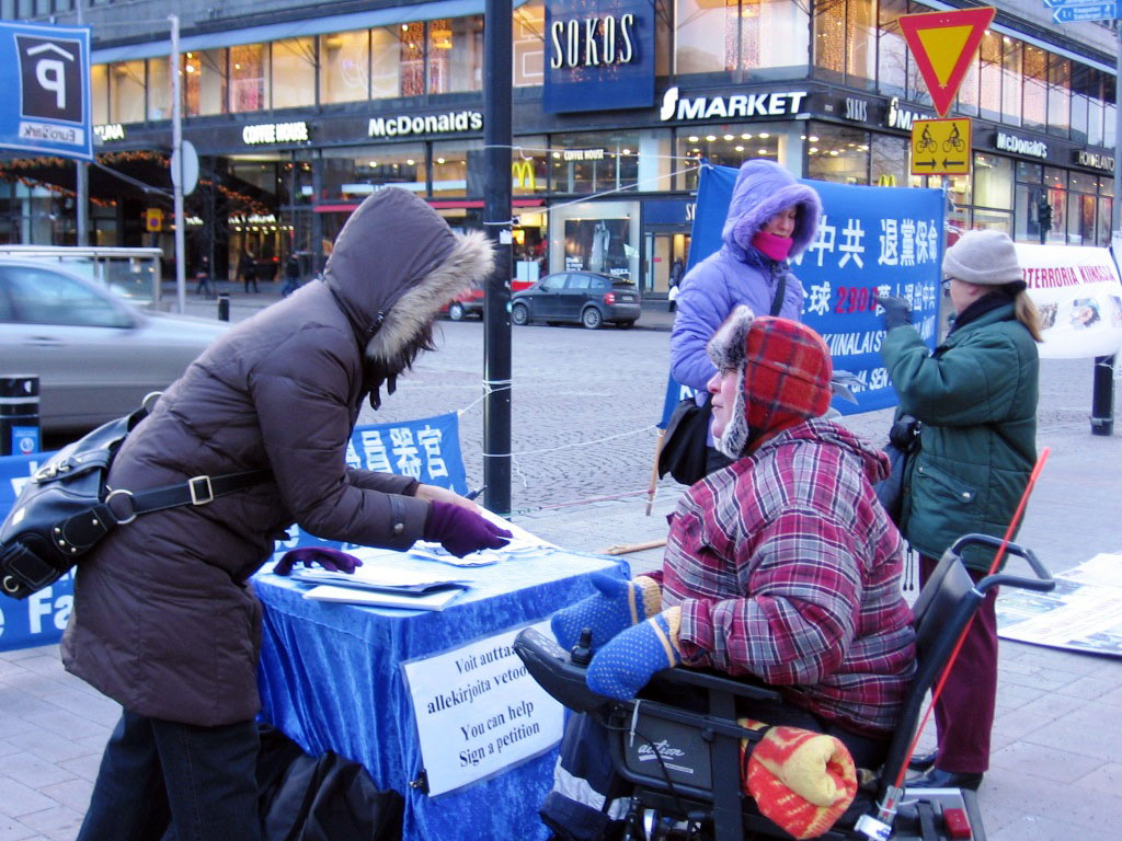 冬日的赫尔辛基寒风阵阵,冻的人们紧缩脖颈匆忙赶路,但活动地点用英文播放的《九评共产党》和中、芬文的“天灭中共 退党保命 声援2900万人退出中共”横幅及法轮功受迫害真相展板和横幅,却吸引来不少民众直奔征签桌前签名声援。