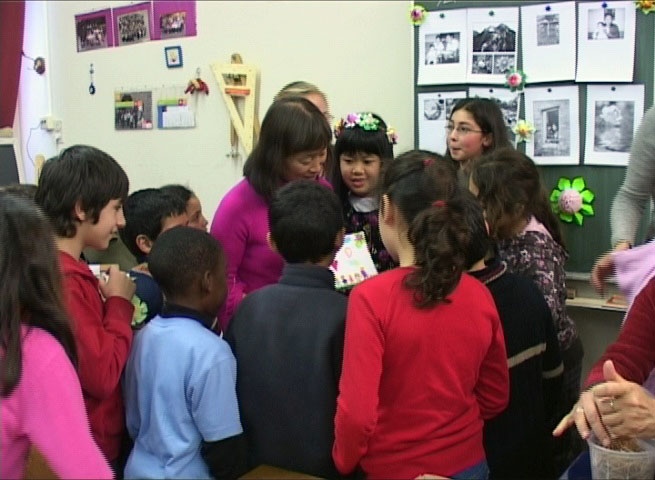 在课堂上,孩子们提问了很多问题,比如问法度你想不想爸爸?你为什么到处旅行等等。法度的妈妈戴志珍随即讲述了是法轮大法让她做到了什么时候都能先想到别人,在克服着家庭悲剧的同时,她们还想到中国还有很多的孩子生活在苦难中,她今天来到这儿也是代表中国的孩子。她让学生们记着“法轮大法好”,“真善忍好”,孩子们也随着她一起高声读着。