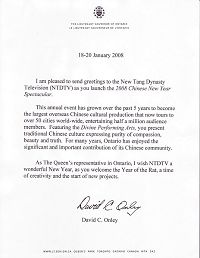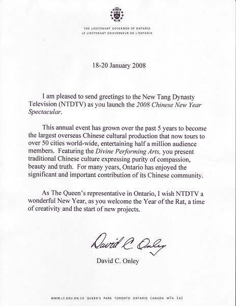 “以神传表演艺术为特色,表现纯善、纯美、纯真的中国传统文化。多年来,安大略省享受了来自华人社区的重大的极重要的贡献。”大卫•奥利在贺信中说,“作为伊丽莎白女王在安大略省的代表,安大略省省督,值此鼠年到来之时,一个创造性的时期和新项目开始之际,我祝愿新唐人电视台拥有一个美好的新年。”