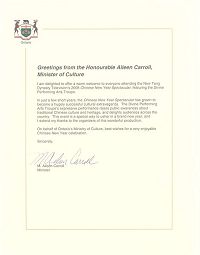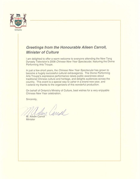 “我高兴的向参加新唐人电视台举办的、由神韵艺术团表演的全球华人新年晚会的观众致以热烈的欢迎。”安大略省文化部部长爱玲•卡洛(M. Aileen Carroll)在贺信中表示,“在短短的几年中,全球华人新年晚会的发展,取得了巨大的成功,是一件文化盛事。神韵艺术团弘扬了中华传统文化和遗产,给加拿大的观众带来欢乐。”