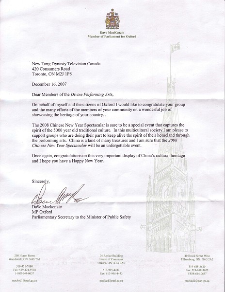 加拿大公共安全部长国会秘书戴夫•麦坎西(Dave Mackenzie)致信神韵艺术团,祝贺该团和其他许许多多的华人社区的人士能够成功的展现自己的文化传统。“二零零八年的华人晚会一定会把五千年的华夏传统展现出来。”戴夫•麦坎西说,“在我们这个多元文化的社会,我非常高兴能够支持你们的晚会,你们正在通过艺术表演的形式保持自己的民族精神。”