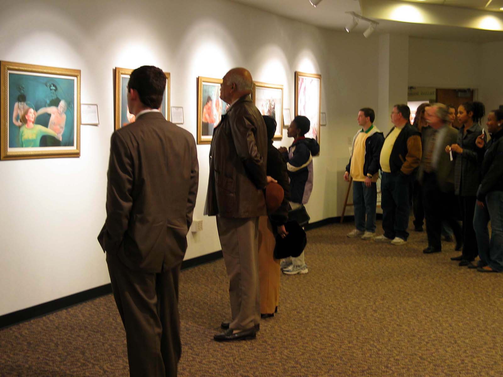 第一展室作品所展现出的大法的美好吸引了许多人,尤其是《佛像》、《誓约》这两幅作品,人们都惊呼:太美了!并纷纷在此留影。第二展室主要体现了大法弟子在中国所遭受的迫害,人们都感到震惊,询问为什么中国会出现这种残酷的迫害,许多西方人当场拿走了英文的《九评共产党》,表示要详细了解中共的邪恶本质。也有部份人询问法轮功是什么。人们主动拿取展室中陈列的真相资料,尤其是有关亚特兰大炼功点的传单更是受欢迎,还有人当场表示要炼功。