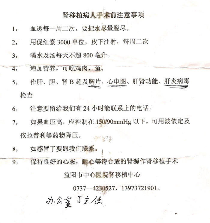 以下是湖南省洪江市硖州乡红村村居仕塘组村民向孙连于2005年到益阳市中心医院换肾后,带回的依据。医院说不要等,病人去,就有肾源。