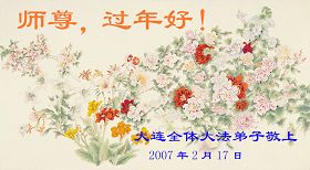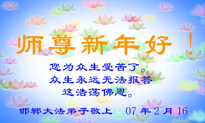 叩谢师尊慈悲洪恩!我们将不辜负师尊的期望,不辜负众生的期盼,不辜负大法对我们的慈悲救度,继续努力做好“三件事”,越最后越精進,助师正法,直到圆满功成!二零零七年二月十六日