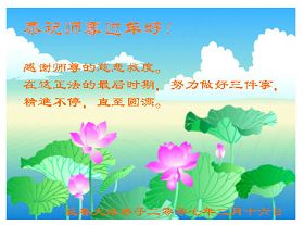 弟子们会更加努力,不负师尊慈悲救度,帮助世人早日了解大法真相,退出邪恶的中共组织,得度。