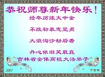 【明慧网二零零七年二月二十日】北京公安系统内的大法弟子、大陆公安系统大法弟子、大陆警察大法弟子、大陆公安系统大法弟子、黑龙江警察系统的大法弟子、闽北公安系统内大法弟子、武警部队全体大法弟子、中国武装警察部队边防部队大法弟子及家属大法弟子、大陆一退伍军人和全体家人、第二炮兵全体大法弟子、大陆全体退役军人大法弟子、大陆军中大法弟子、西宁、青藏兵站部的大法弟子、广州军区大法弟子,给师尊李洪志先生拜年、祝师尊新年快乐!