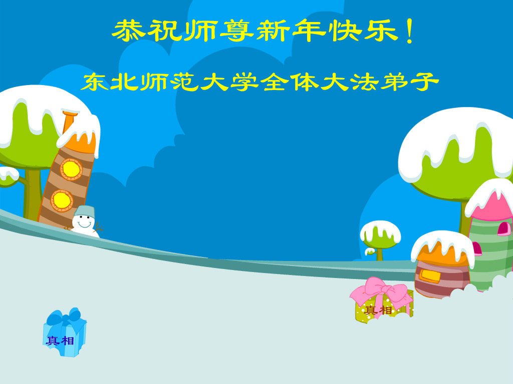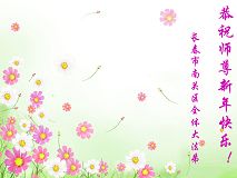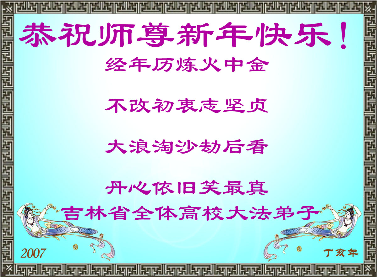 长春吉林省科技厅大法弟子、大陆教育系统全体大法弟子、广东省教育系统大法弟子、贵州教育界大法弟子、武汉华中科技大学全体大法弟子、历届河北大学全体大法弟子、江西省高校大法弟子、河南省体育系统全体大法弟子、郑州大专院校的大法弟子、山东潍坊市教育系统全体大法弟子、上海交通大学大法弟子、天津南开大法弟子、长春高校大法弟子、中山大学大法弟子、武汉科技大学大法弟子、军医大学大法弟子、西安高校大法弟子、大连理工大学全体大法弟子、上海市嘉定教育系统大法弟子,西南交大大法弟子、江西高校、清华大学(中国北京)大法弟子、西安交通大学大法弟子、上海高校大法弟子(包括暂时失去人身自由的),恭祝师父新年快乐!