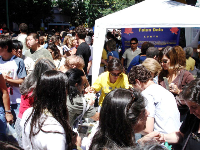 每次表演时,法轮功学员会发给观众传单,讲述她们为什么表演莲花舞。表演完后会介绍法轮功并讲述发生在中国的迫害真相。阿根廷人不停的说:太美了,太美了!并且关注的倾听真相。摊位上也挤满了人群拿传单,听真相。学员们没有料到有那么多的对法轮大法有兴趣的人,不得不一次又一次的加印传单。街上不停的听到人们听着歌声,手拿着传单念“法轮大法好”。晚上八点园游会结束前,学员在摊位前演示功法,再度引起轰动。