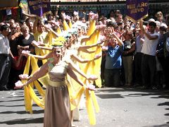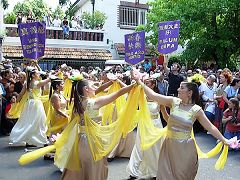 在开幕典礼表演了一场后,学员们转到街上不断的表演,成为园游会的高潮。观看表演的人潮瘫痪了已经非常拥挤的街道,以致警察不得不要求稍微减少表演的次数。因为太多人想看舞蹈,仙女只有游行,一边走,一边舞。“法轮大法好”的歌曲飘荡在整个中国城。游行时,观众都想接近跳舞的学员,把她们围的几乎不能跳。