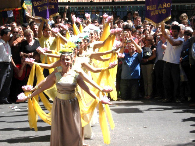 我们是阿根廷的法轮功学员。今天是新的一年的来到,为了向大家拜年,我们准备了一场中国传统舞蹈。