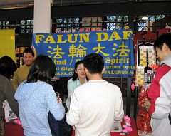 一些华人受中共谎言的毒害,对法轮功存有疑虑,但精美圣洁的莲花把他们吸引过来。当学员向他们讲述法轮功真相并赠予光碟时,他们眼中的惊疑渐渐消失。