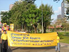 ![]() 法轮功学员的游行队伍色彩亮丽,美好祥和 |