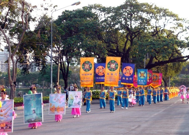 游行队伍的前面是「法轮大法好」、「世界需要真善忍」等横幅,后面紧跟着手捧「真善忍美展」作品的仙女、印有法轮图的洪法旗、腰鼓、龙旗、舞蹈队等,鼓声阵阵,彩旗翻飞,壮观浩荡。