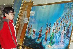 真善忍画展在活动中展备受瞩目。老人全保公司(Senior Whole Health)社区代表翁日媚女士看了真善忍画展、得知真相后,告诉学员,“这场迫害太残酷了!我们可以联合抵制明年(在北京举办)的奥林匹克运动会,来表示对你们的支持。”新英格兰艺术会的林草培先生在画前逗留许久。他仔细观赏每一幅画作后,慎重询问学员可否购买这些画。一对老年夫妇,特别喜欢《誓约》这幅画,老太太神情庄重的站在画前,请老伴给拍照留念。
