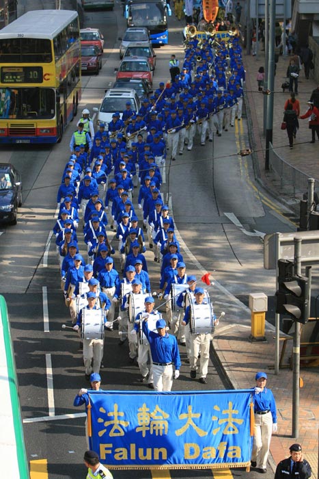 游行队伍中,也有展示法轮大法美好的阵列,由腰鼓队与仙女队领头,呼吁民众快快找真相。