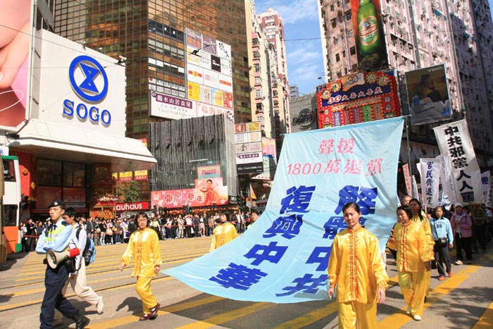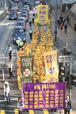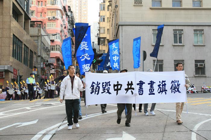 【明慧网二零零七年二月六日】“香港退党服务中心”等民间团体在二零零七年二月三日下午举行大游行,声援中国大陆一千八百万勇士退出中共,沿途受到大批民众欢迎。参与者与旁观者都纷纷谴责罪恶滔天的中共邪党,并预期退党大潮促成中共解体就象骨牌式的倒塌一样,必然发生。