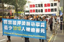 参与游行人士要求释放被非法关押的法轮功学员及法办中共恶首。