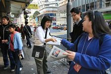 法轮功学员手持横幅,呼吁世人快快找真相。