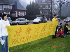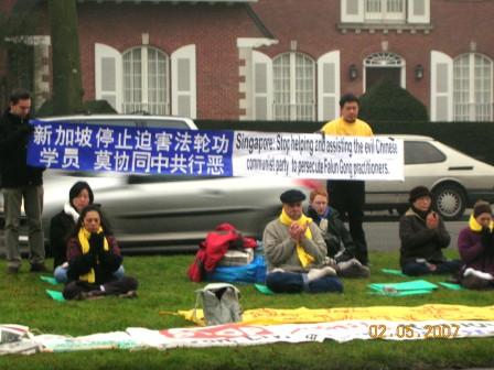在当地警察的协助下,比利时法轮功学员代表与拉维先生一同约见了新加坡使馆一等秘书及领事阮麻先生(Rama)。法轮功学员向他讲明了法轮功学员在新加坡受到的不公正对待及为什么来新加坡使馆抗议,并希望新加坡政府不要追随中共政权,参与迫害法轮功。这位新加坡官员表示,法轮功在新加坡是合法组织,新加坡是允许人们修炼法轮功的。当他提到所有的组织都应该遵守法律时,特意赶来的拉维先生以自己为法轮功学员辩护的亲身经历告诉他,针对法轮功学员的起诉是不公正的,而且人们在新加坡没有请愿的权利,这就是为什么今天他来这抗议的原因。他尤其谈到在他为法轮功学员辩护时,竟然发生了新加坡警察命令他交出辩护用的物证这样的事情。他呼吁全球的新加坡公民都去新加坡使馆来表达关注。
