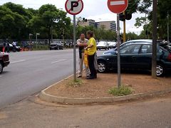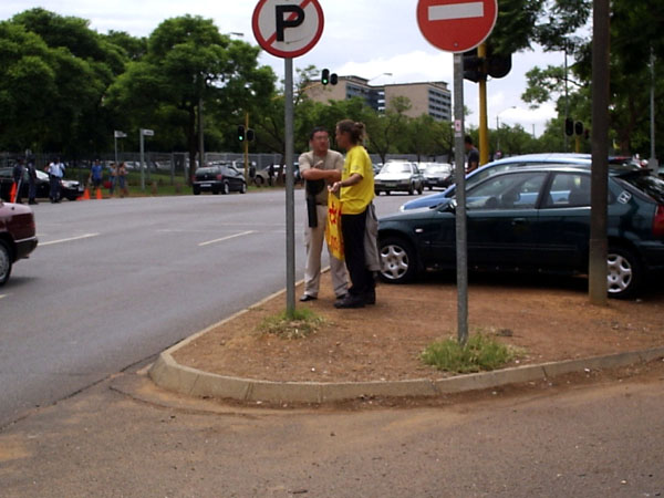 法轮功学员打出抗议标语及“法轮大法好”的横幅,并向维护治安的警察及过往的行人洪法,讲真相。知道真相的友好的南非人民向法轮功学员表达了衷心的支持与祝愿。