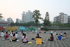 ![]() 大湾炼功点成立于二零零一年八月,地点在台南永康大湾国小的圣火台前 |