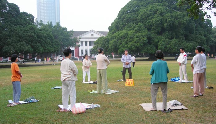 炼功点的学员年轻人比较多,有大专教授、国中教师、硕士生、大学生、飞行官、退休的老师、药剂师、劳工以及公司业务员、家庭主妇等士农工商各行各业都有,每日风雨无阻坚持来炼功。