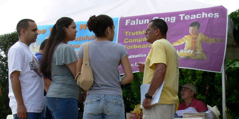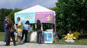 此次盛会吸引了上万人前来观看。法轮功的展示摊位恰巧位于三岔路口,来往的游人大都会路过。法轮功学员在音乐伴随中一遍又一遍的演示着舒缓优美的五套功法,现场的看板及横幅都吸引了人们的目光。很多人都好奇的询问法轮功是干什么的;有相当多的人说他们知道一些法轮功的情况,在中国被禁止;也有不少人知道法轮功是一种很好的功法,正在遭受中共的迫害,纽约等许多地方都有他们的和平抗议活动。当法轮功学员耐心细致的讲述有关法轮功、法轮功遭受的迫害、以及中共活体摘取法轮功学员器官的惊人内幕,游人们无不感到震惊、愤慨。很多人完全不受其它热闹喧天表演的吸引,也暂时忘记美食的诱惑,耐心聆听大法学员讲清真相。有几位民众在得知真相后忍不住潸然落泪,一位女士甚至泣不成声。
