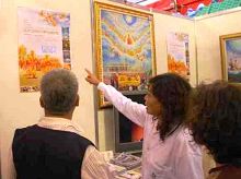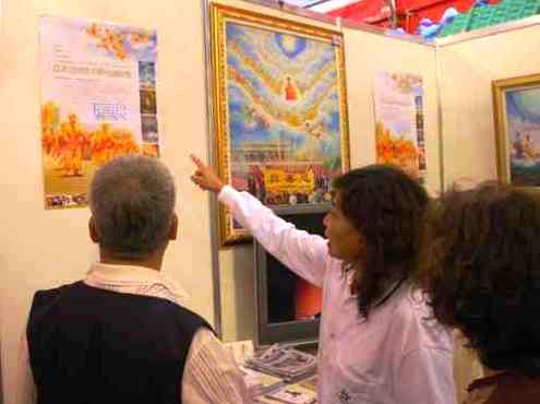 几位女学生站在名为“转大法轮”的画作前久久不去,一位导览人员趋前向她们说明:“这是法轮功创始人李洪志先生在法会中打出层层法轮,为不同情况的五千个弟子,赐予各种美好,画中有大大小小的法轮飞旋在弟子们的五脏六腑之间进行大清理,神奇无比。这是开天目的弟子看到李老师高大无比,打出红色的能量流,充满整个会场的殊胜景象。”