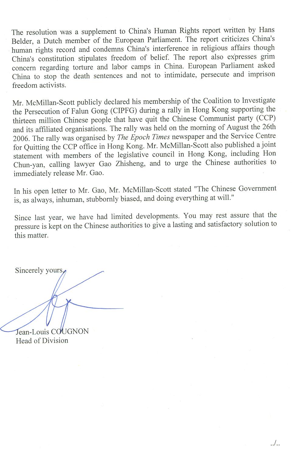 欧洲议会分部主席COUGNON在二月十三日的来信中写道:“经过几个月的努力,我们终于被通知了你丈夫的下落,知道他依然活着。我们强烈谴责将法轮功学员关押到监狱、劳教所、拘留所、和精神病院,并施以酷刑;我们非常关心被关押的法轮功学员器官被摘取卖给医院的有关报告;要求中共立即停止对法轮功学员的关押和酷刑并释放他们。”