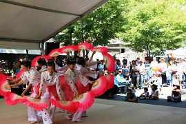 法轮功学员今年受到邀请在舞台上示范法轮功功法并表演中国舞蹈。姑娘们身着亮丽飘逸的服装,气质脱俗,舞姿优雅,吸引了众多游人驻足观看并赞叹不已:太美了!而祥和的法轮功功法更是在一片喧闹的气氛中带给人们心灵的宁静。