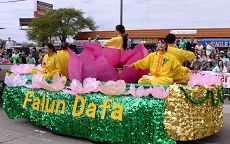 【明慧网二零零七年三月十九日】二零零七年美国德克萨斯州达拉斯市格林威尔大道(Greenville Ave)的圣•派翠克日(St.Patrick'sDay)大游行于三月十七日举行。长达两英里的游行路线两旁站满了身着各种绿色饰物的观众,上百个团体更是把自己的队伍用绿色来装扮,使整个格林威尔大道充满了春的气息。游行中唯一的以华裔为主的团体是当地法轮功学员的队伍,其以金黄色为主色的队列、花车,宛若这万绿丛中的一朵金色莲花,把法轮大法的祥和、美好带给人们。队列所经之处受到人们的欢迎,许多观众热情的欢呼着,“法轮大法!法轮大法!”