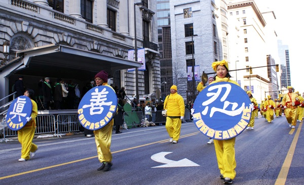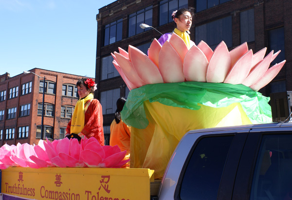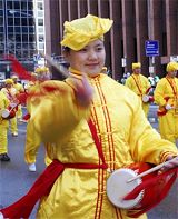 法轮功学员以其独特的风姿展现法轮大法的美好。走在前面的学员拿着写有“法轮大法”的横幅,其后是花车,上面有坐在莲花中的“仙女”,车内有学员展示功法,后面是持“真善忍”牌匾的学员,然后是中国传统的腰鼓队。